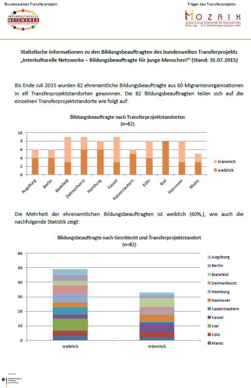 Bis Ende Juli 2015 wurden 82 ehrenamtliche Bildungsbeauftragte aus 60 Migrantenorganisationen in elf Transferprojektstandorten gewonnen. Die nachfolgende Statistik zeigt weitere Informationen wie zum Beispiel zu den Transferprojektstandorten, zum Geschlecht, zum Standort und Alter, Herkunftsland, zu den Sprachkenntnissen der Bildungsbeauftragten und zum Bildungs- und Berufsabschluss. [Zur Statistik]