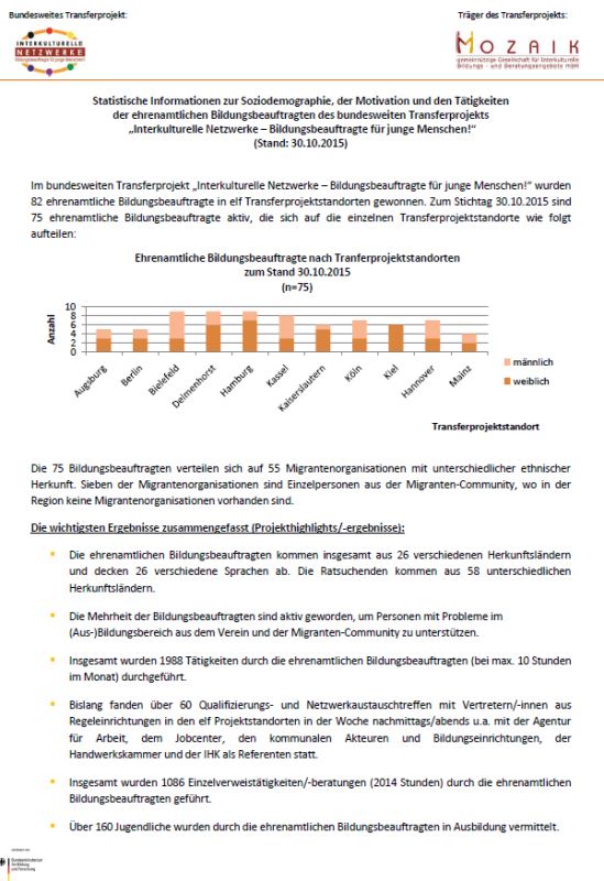 Bis Ende Oktober 2015 wurden 82 ehrenamtliche Bildungsbeauftragte in elf Transferprojektstandorten gewonnen. Die nachfolgende Statistik zeigt weitere Informationen wie zum Beispiel zu den soziodemographischen Merkmalen der ehrenamtlichen Bildungsbeauftragten, zu der Motivation, zu den Tätigkeiten etc.
